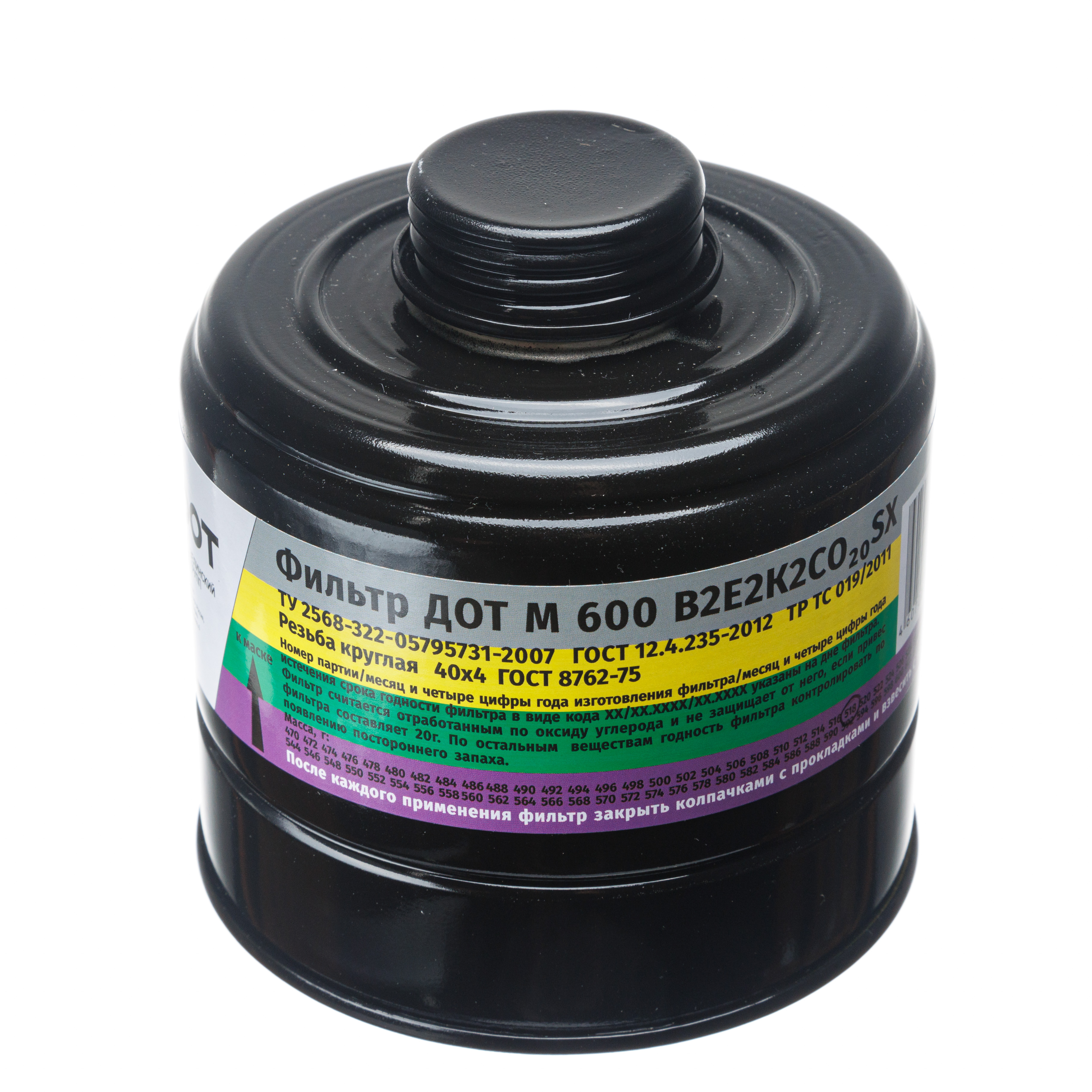 Фильтр противогазовый ДОТ М 600 марка В2Е2К2СО20SX в металлическом корпусе предназначен для защиты от неорганических газов и паров (хлор, фтор, бром, сероводород, арсины, фосфористый водород и т.п., за исключением монооксида углерода и циана водорода); кислых газов и паров (диоксид серы, хлористый водород, бромистый водород, фтористый водород, пары серной, уксусной, муравьиной, азотной, фосфорной кислот и т.п.); аммиака и его органических производных; монооксида углерода, в комплекте промышленного фильтрующего противогаза ДОТ М.