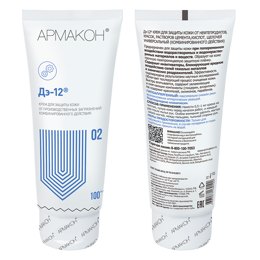 Крем АРМАКОН ДЭ-12 для защиты кожи от нефтепродуктов, красок, растворов цемента, кислот, щелочей универсальный (комбинированного действия)